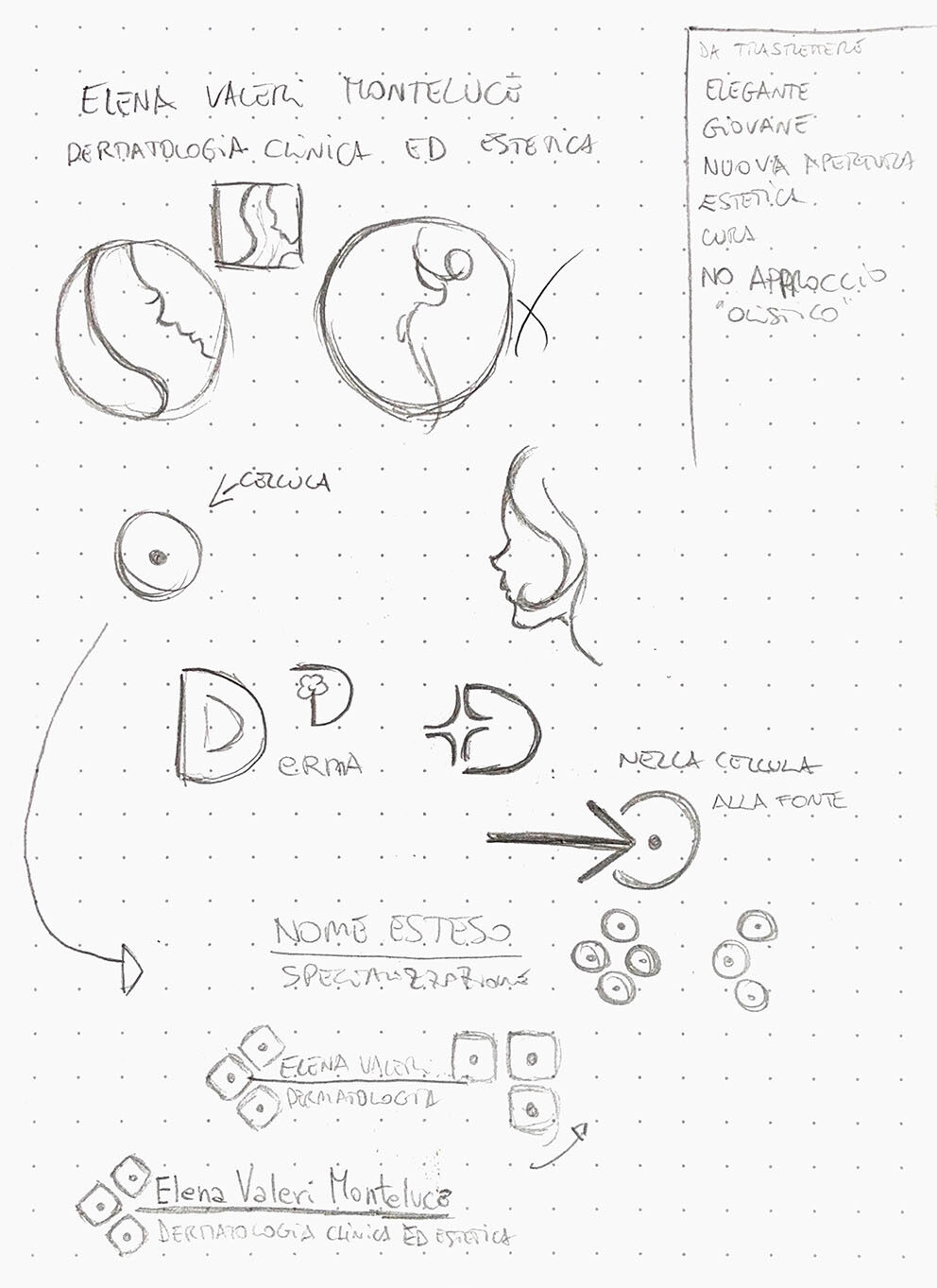 Mi concentro su come rappresentare la pelle, ma le silhouette mi restituiscono la sensazione di un qualsiasi centro estetico. Quindi vado nel “micro”: la pelle รจ fatta di cellule, un dermatologo tratta le cellule della pelle, sia clinicamente che esteticamente.